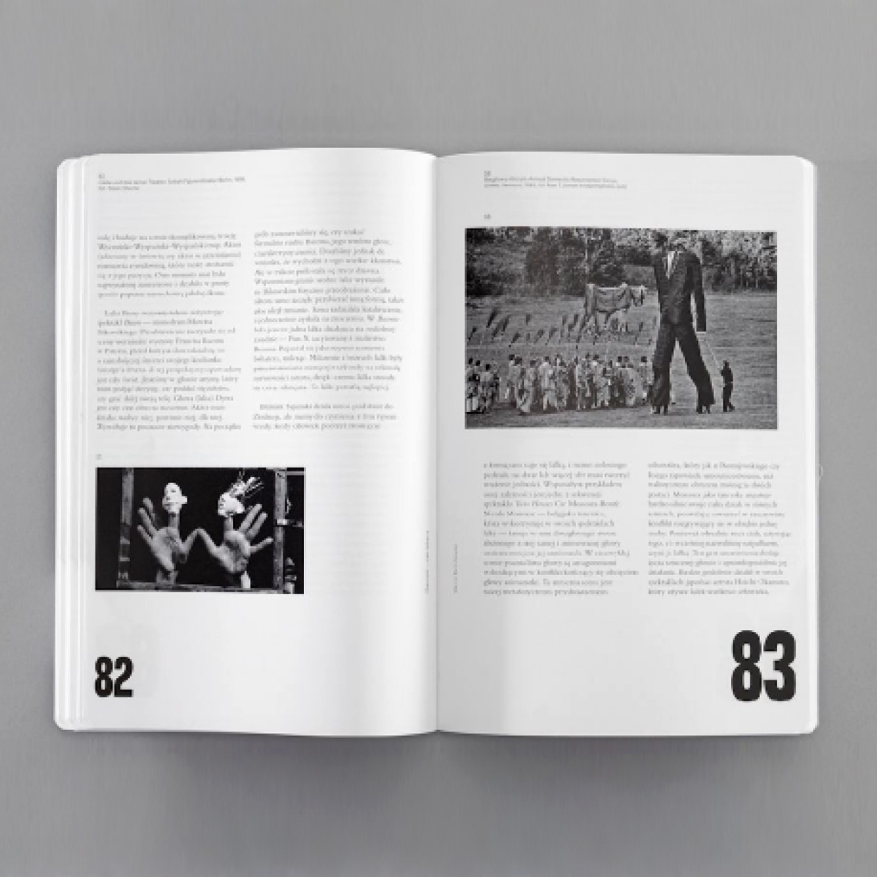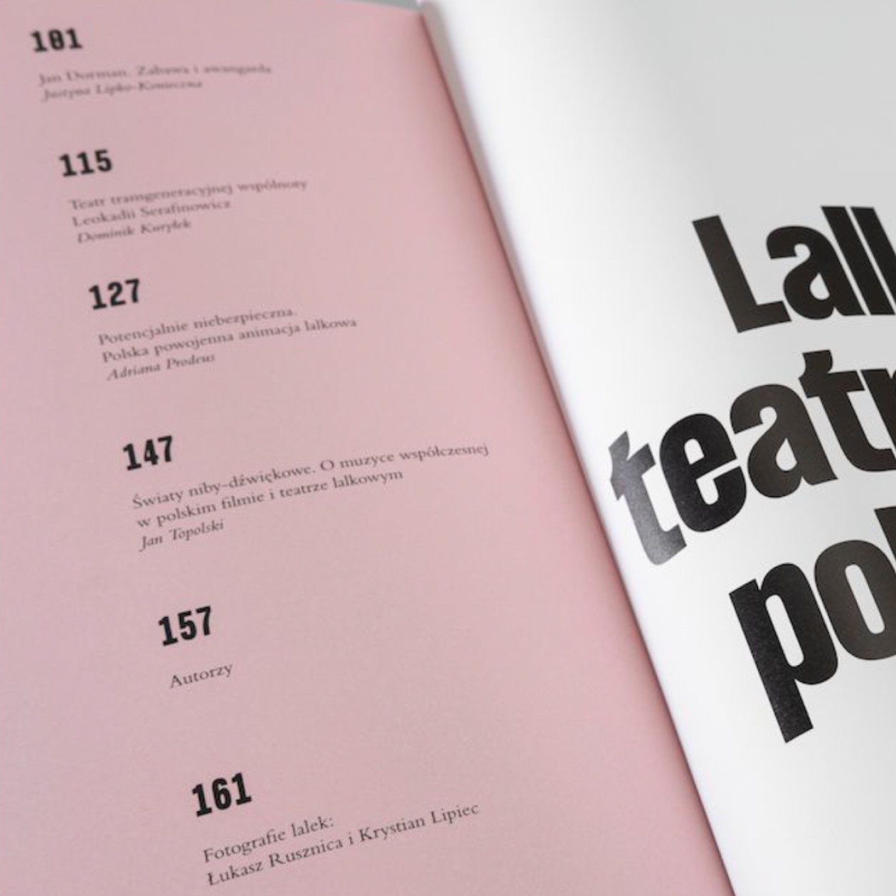 The book accompanying the exhibition of the same title is a pioneering publication containing ten essays, the authors of which take up threads concerning the aesthetics of puppet theatre, its entanglement in politics, the connections between puppet theatre and photography, the phenomenon and potential of puppets, puppet theatre for adults, pedagogical aspects of puppet stages, but also the history of puppet animated films and music in puppet theatre and films.